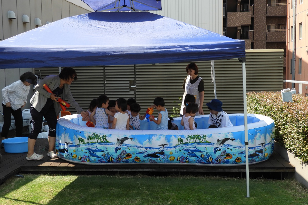 病院の屋上でテントを張って、プール遊びをしました