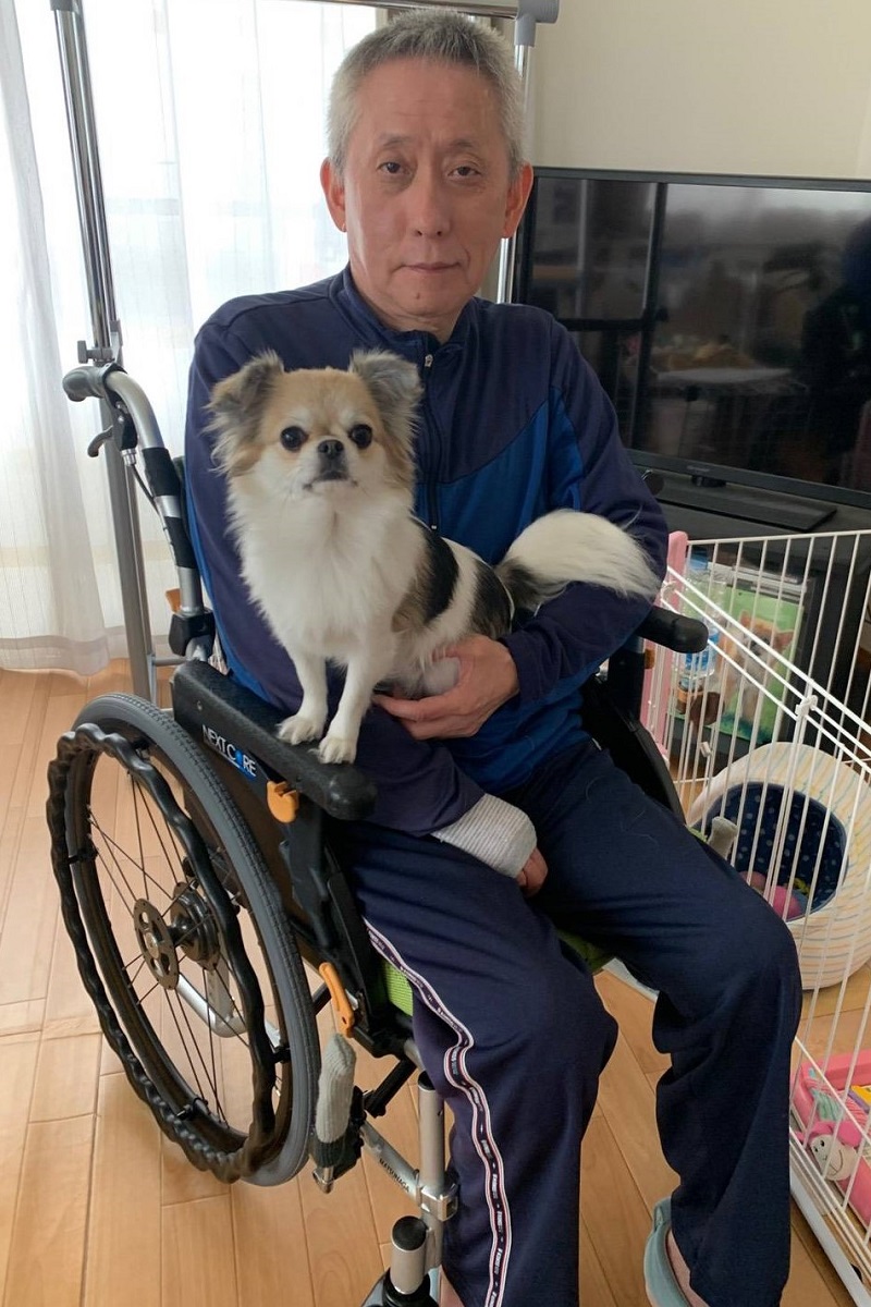 利用者様が叶えた夢をご紹介します。それはペット(犬)を飼うことです。右半身の麻痺がある利用者様にとってペットのお世話をするのはとても大変なことだと思います。しかし、遊び相手になったりトイレの掃除をしたり、一生懸命お世話をしてくれているご主人にモモちゃん(犬)はとても懐いており、利用者様もモチベーションや生活の質の向上に繋がっていると思います。本当に微笑ましい家族です。写真はリハビリ後、車椅子に座る利用者様の膝の上で乗り慣れた様子でポーズをとってくれたものです。