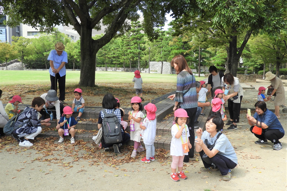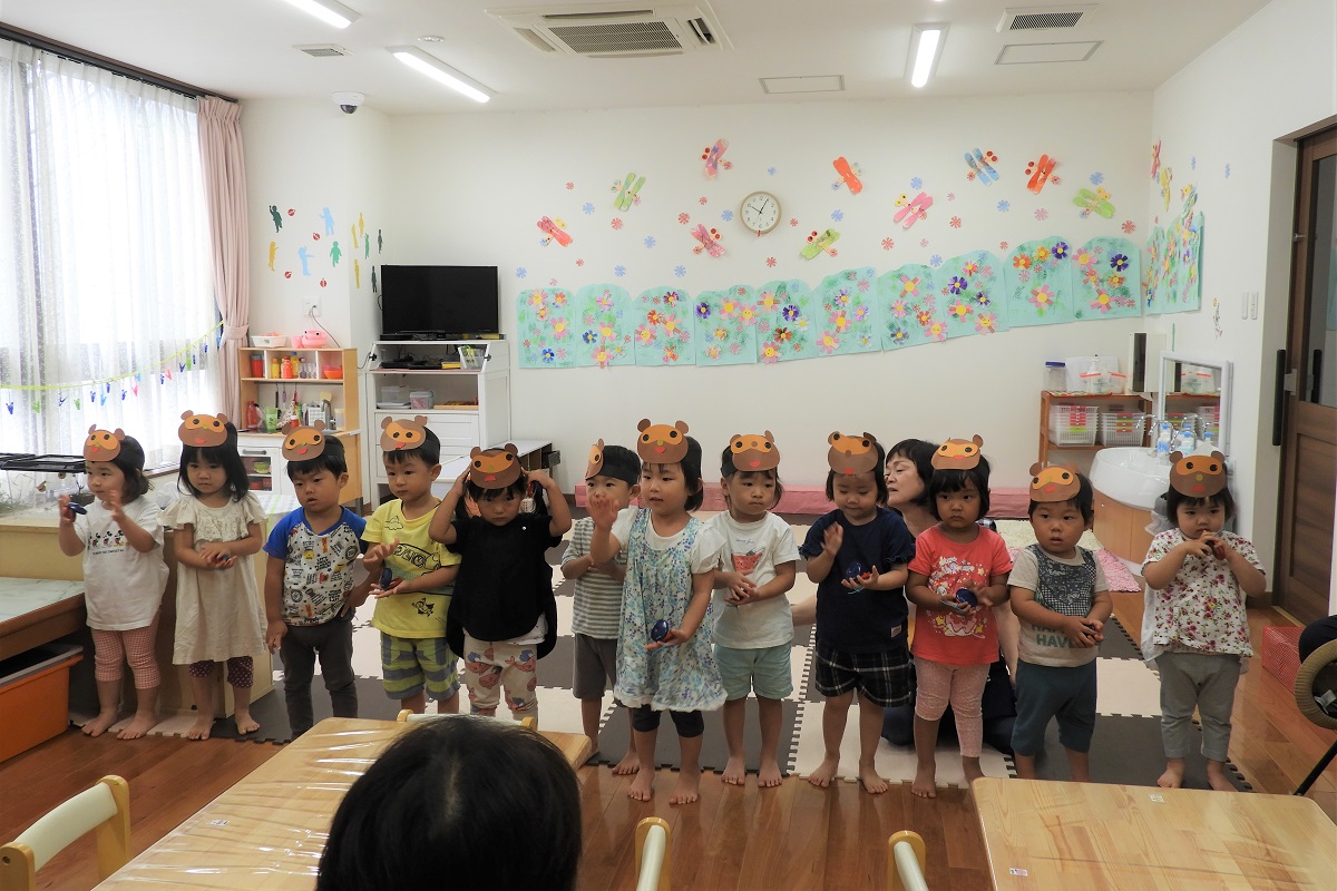 お部屋でおじいちゃん、おばあちゃんと一緒に製作をしたり、「ぽんぽこたぬき」の歌に合わせて、カスタネットの楽器演奏を披露したり、中央公園にお散歩に出かけて、シャボン玉遊びを楽しみました。
