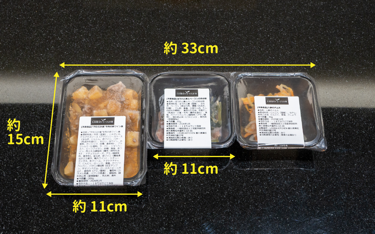 それぞれのサイズと容器見本を掲載しますので、冷凍庫のキャパシティの参考にしてください。